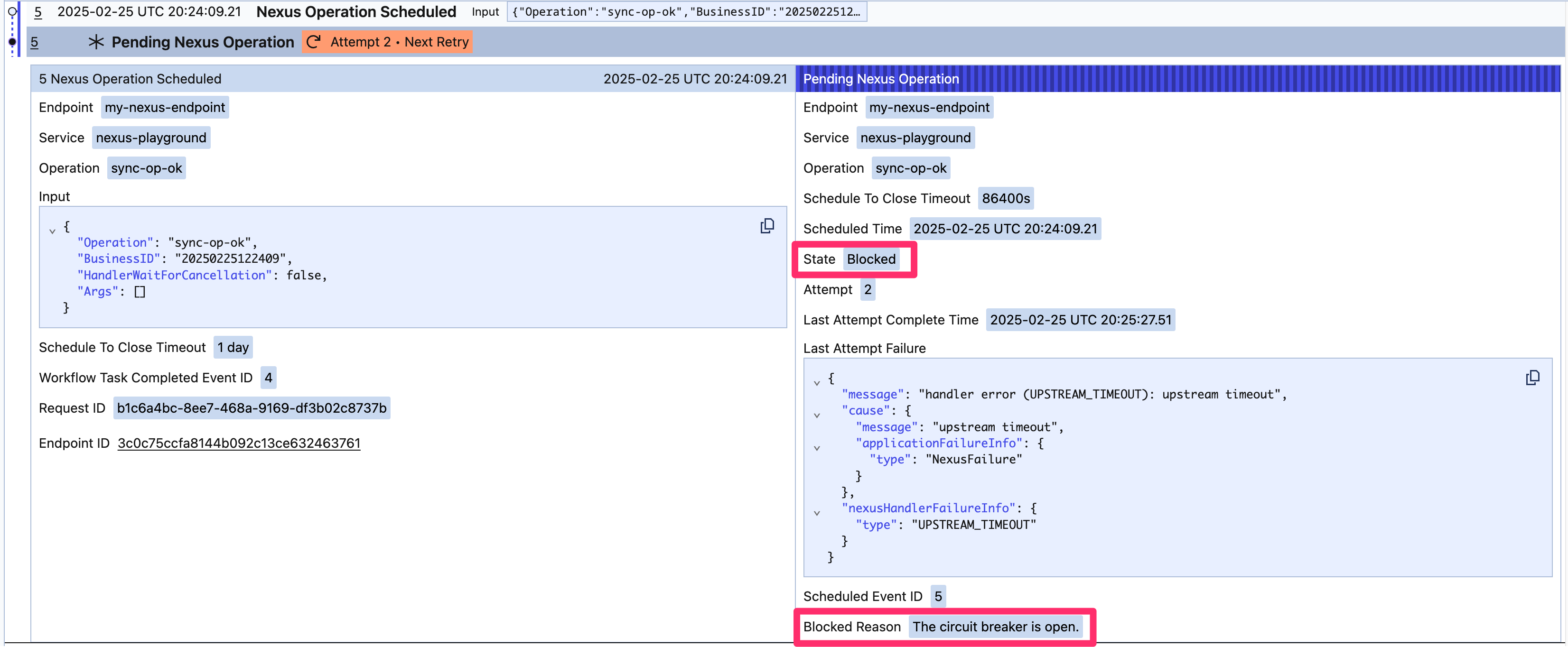 When the circuit breaker for a destination pair is tripped (i.e., the circuit breaker is open), the Pending Nexus Operation for a Nexus Operation Scheduled event surfaces a State of Blocked along with a BlockedReason.